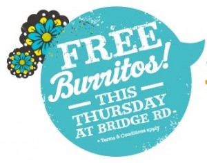 Come and celebrate ‘New Life Starter’ at Bridge Rd Richmond with FREE BURRITOS on Thursday 21st November 2013 from 11.30am – 8.00pm! What do I need to do to get a FREE burrito? Can I get any burrito of my choice? Can I add extras like guacamole? Burritos on offer will be: Baja Steak, Chicken Fajita, Chicken and Guac and Mucho Veggie. FREE burritos cannot be altered or have extras added. Click here to view full ingredient listings for each burrito. Can I order other food items?