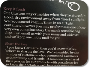 It says on the carms box “We recommend keeping your muesli in an airtight container, however you may prefer to use one of our very own complimentary Carman’s reusable bag clips. Just email us with your name and address and we’ll pop one in the mail for you”. Email your name and address to [email protected] asking nicely for your free sample