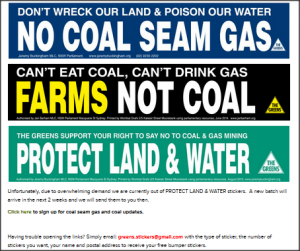 Click on the sticker to apply Greens MPs Jeremy Buckingham and Jan Barham have printed bumper stickers and leaflets to promote campaigns. They are free to those who can put them to good use. To order a bumper sticker, simply click on the sticker you want and provide your contact details and the number of stickers you desire in the email that pops up. If you would like more than 100 stickers to distribute, please contact my office on 9230 2202.